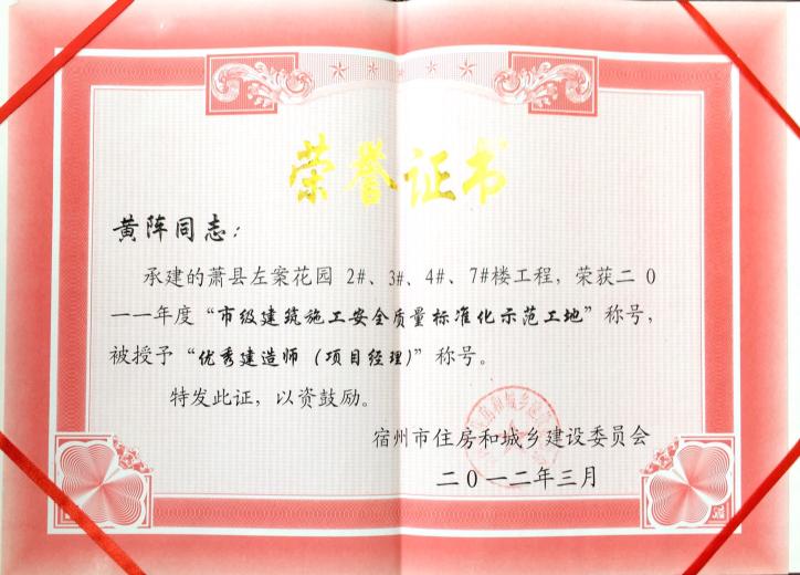 >黄阵承建——萧县左岸花园2#、3#、4#、7#楼工程被授予优异制作师(项目司理)
