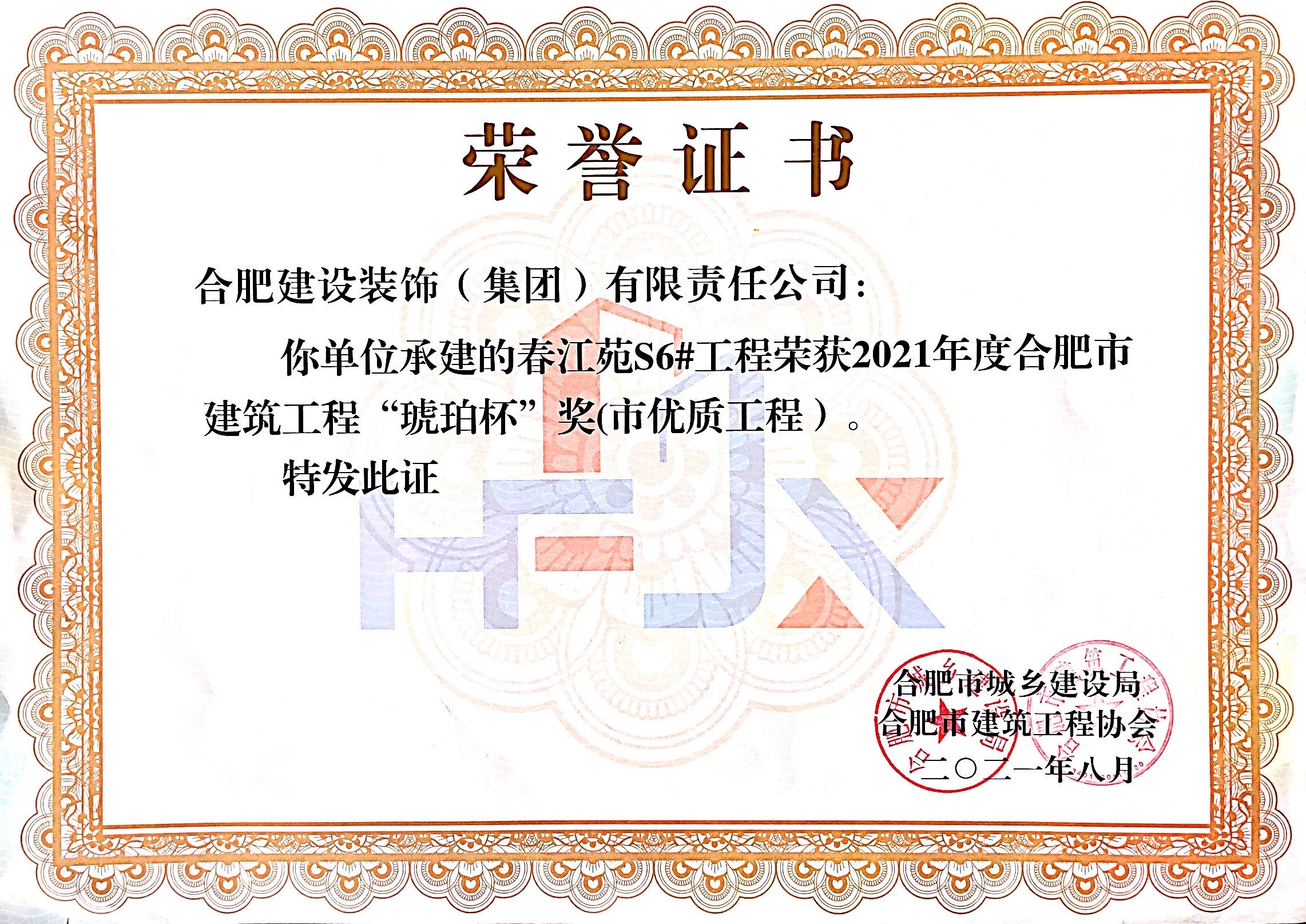 >春江苑S6#--2021年度合肥市修建工程“琥珀杯”奖(市优质工程)
